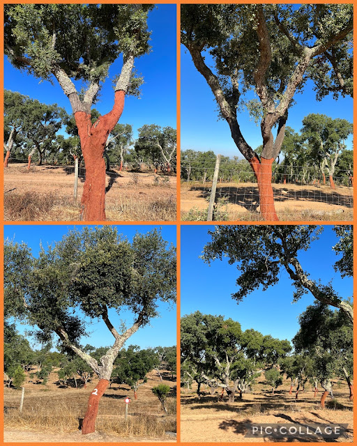 The process of removing the outer bark is done once every 9 years. A red tree indicates it has had its bark recently removed. The '2' indicates that it was removed in 2022. The hardy cork oak then grows a new layer of bark. The protection of cork trees by law has resulted in thousands of acres of protected forests.